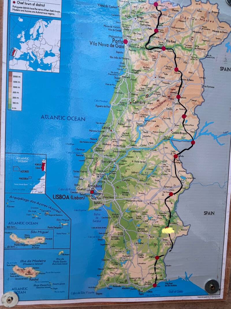 Here's a picture of our route through Portugal – what an incredible journey it has been! It's hard to believe we only have two days left. The yellow dot (or squiggle) shows where we are right now.